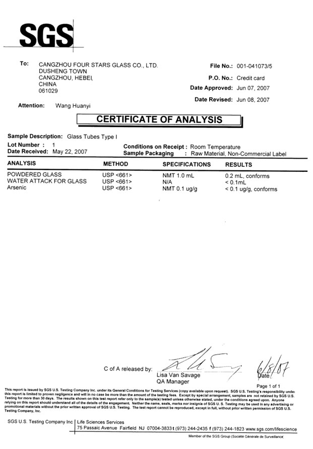 ISO国际标准,玻璃管颗粒法耐水I级为耗酸量小于1ML,国际同行业的数值是0.35ML,而我们是0.2ML(数值越小质量越好),此项技术已经获得了美国权威检测机构SGS的检测证书,此产品已经达到国际先进水平。
